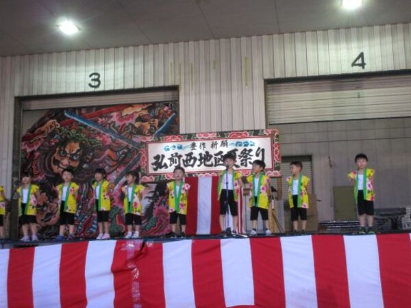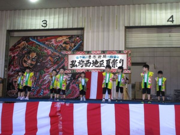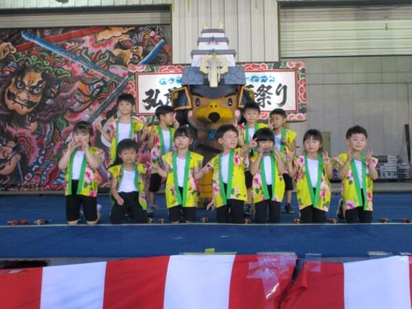 写真@A JAつがる弘前 弘前西支店の夏祭りにくま組(5歳児) きりん組(4歳児)がお遊戯、歌を披露してきました。 たくさんのお客さんに圧倒され緊張しましたが、 最後まで立派に披露しました。 写真B たかまるくんと一緒に最後写真を撮りました。 「カメラより、たかまるくんが気になる〜」 |