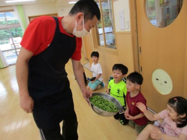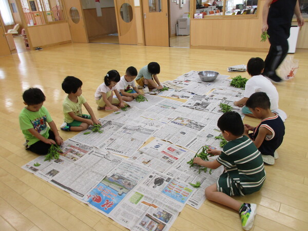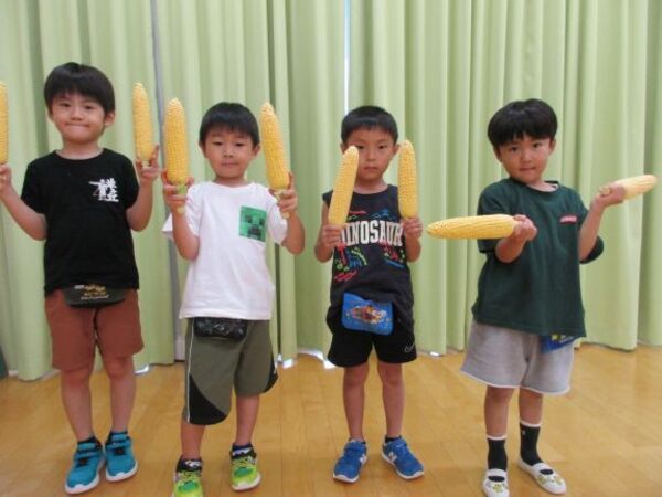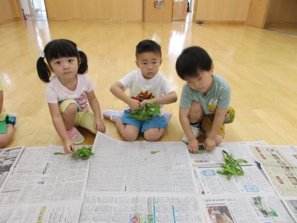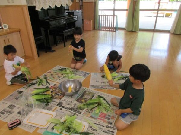 食育指導の一環として、うさぎ組(3歳児) 4歳児(きりん組)くま組(5歳児)さんは 豆を枝からとったり、トウモロコシの皮をむいたり しました。 写真@A みんな真剣な表情。 写真B 「みんながとってくれた豆はおやつの時間に食べますよ〜」 たくさんとれたね〜 写真CD くま組(5歳児)さんは、トウモロコシの皮むきに夢中。 「上手にできたよ〜」 |