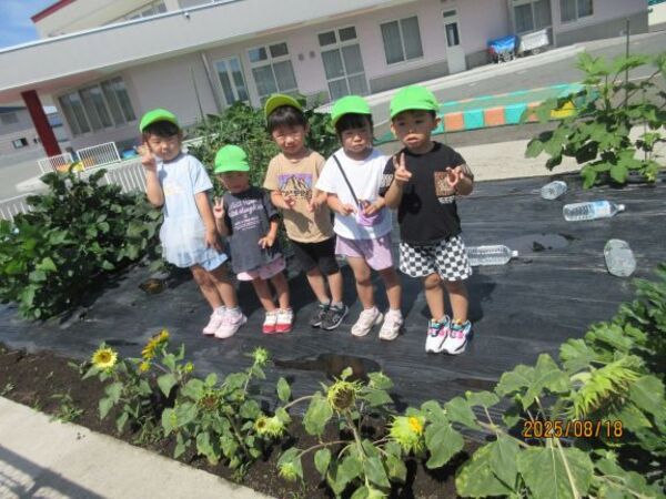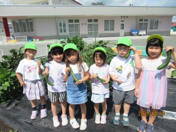 写真@ ミニひまわり、きれいに咲いて大喜び♡ 写真A みんなで育てたきゅうり♪ 「いろんな形のきゅうりを収穫したよ!」 |